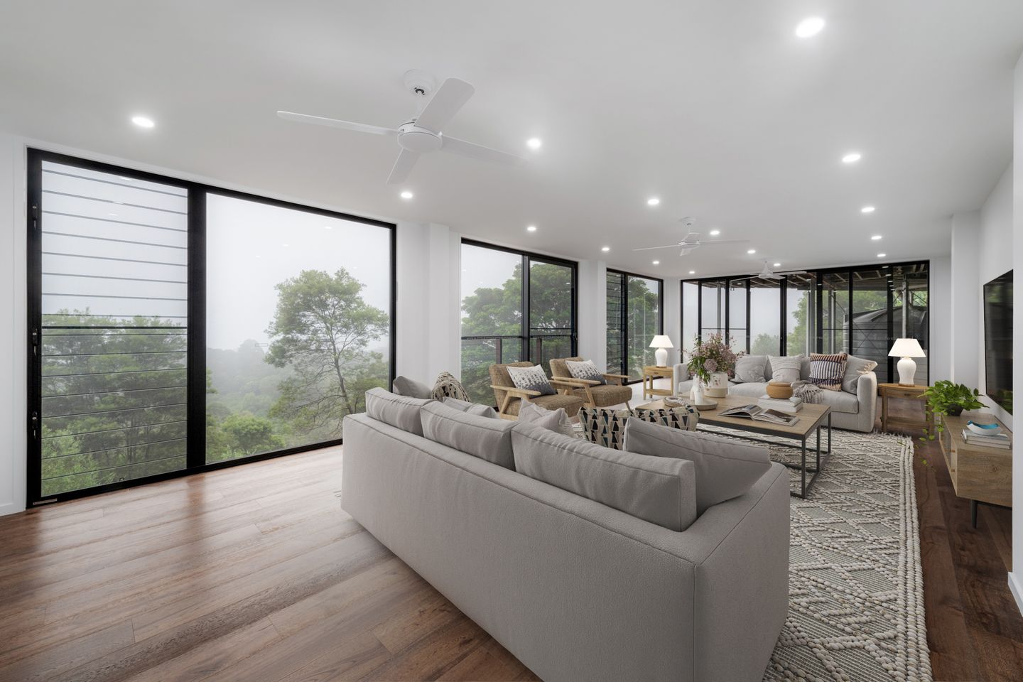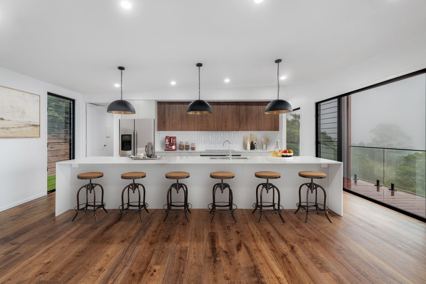 Saltair’s expertise in designing for complex sites made this project possible. The home features an angled layout, carefully designed to follow the shape of the block and maximise the stunning views. To achieve this, several modules were designed in triangular shapes - departing from the usual rectangular format - allowing the home to seamlessly hug the landscape. Despite the difficult access, the Saltair team worked closely with the crane company to ensure a smooth and efficient installation. The final result? A breathtaking, light-filled home with a spacious kitchen, a walk-in pantry with abundant storage, a luxurious walk-in robe, and thoughtfully placed windows, including fixed and louvred options, to enhance views and airflow. The clients are absolutely thrilled with their home, proving once again that modular can achieve the extraordinary, even in the clouds.